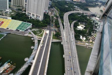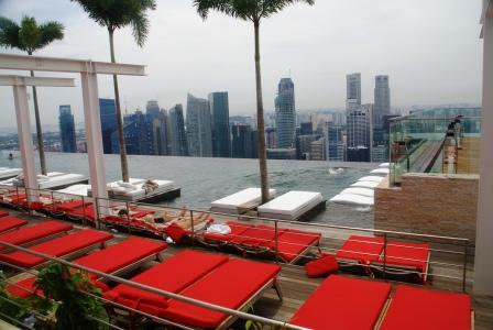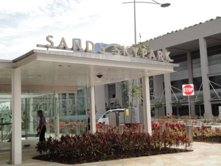 "Das Marina Bay Sands ist ein Casino mit angeschlossenem Hotel in der Marina-Bucht (Marina Bay) von Singapur. Auf den drei Hoteltürmen befindet sich eine 340 m lange Plattform, die u. a. einen Park mit Swimmingpool beinhaltet. Der Ausleger ragt in 200 m Höhe 66 m weit über freien Grund. Das Bauwerk wurde von dem Architekturbüro Aedas aus Abu Dhabi (Vereinigte Arabische Emirate) entworfen" (Auszug aus Wikipedia) Da heute Sonntag ist stehen wir schon 20 Minuten später vor dem Gebäude.... Wow !!!! Wir lösen uns Tickets für den Fahrstuhl zur Aussichtsplattform im Keller des 1. Turms. Dort auch Null Wartezeit. Der Spaß kostet 20 SING$. Wir haben unsere Badesachen zwar auch in der Hosentasche, aber wie schon vermutet, ist der Pool oben nur "for Hotelguests only" ;-((