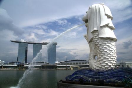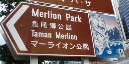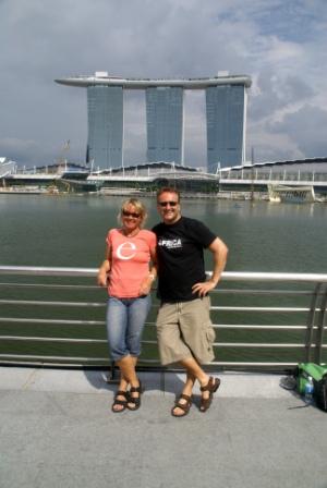 Unten am Gebäude gibt es noch ein Casino und eine Shopping Mall (die wievielte in Singapore ??). Wir lösen uns von dem Ausblick, nehmen uns vor dem Gebäude das nächste Taxi und lassen uns auf der anderen Seite am Merlion wieder absetzen. Dort schießt Sebastian von uns noch ein Erinnerungsfoto.