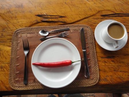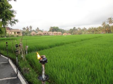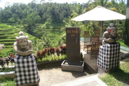 Atmosphäre mit Blick auf ein Reisfeld. Wir bestellen die Spezialität des Hauses,