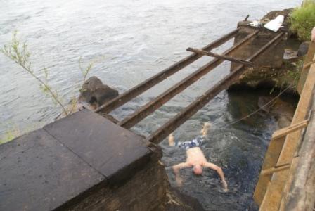 und hat sich vorsichtshalber angeleint damit er nicht wegen der Strömung