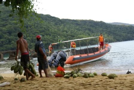 mit einem Schoner-Boot oder einen Speedboot zum Ankerplatz fahren lässt und dann