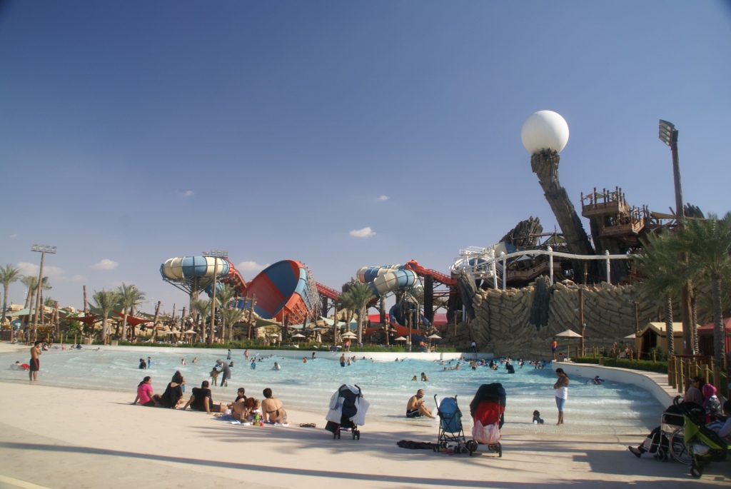 Um 17:00 h verschwinden wir wieder, denn es wird langsam frischer. In dem Park gibt es übrigens auch 2 große Fön-Kabinen (für jeweils 3 Personen) wo man sich für 10 AED (~ 2€) trockenföhnen kann. Wir fahren noch zum Al Racha Beach mit seinem spaceigen, runden Hotel. Im Sonnenuntergang ein echter Hingucker !