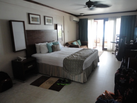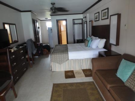 Der Barbados $ ist an den US$ angelehnt (2 BB$ = 1 US$). Unser Hotel liegt direkt an der St. Lawrance Gap. Da ist am meisten los, habe ich gelesen. Wir wollen ja nicht vereinsamen und Abends was zum Futtern haben... wenn wir die ersten Tage schon ohne Mietwagen sind... Zum Autofahren bekommt man vor Ort eine Lizenz. Diese gibt es vom Autovermieter. Preis 10 BB$ Es herrscht Linksverkehr. Mehr Infos hier: http://www.visitbarbados.co/de/mietwagen.html Bei Dauerregen bringt uns der Fahrer in einer recht ausgelutschten Kiste zum Hotel. Da die Fahrt nur 15 Minuten dauert ist das zu verschmerzen. Wir sind recht trüb gestimmt, haben wir doch 7 Tage reinen Badeurlaub vor uns und Wetteronline prophezeit nichts Gutes. Aber wir sond schon mal hier. Hatte ja auch ein Hurricane kommen können, die Zeit ist ja noch nicht ganz vorbei. Unser Apartment im "YELLOW BIRD HOTEL" ist auch schon bezugsfertig. Es ist toll ausgestattet. Hier werden wir uns wohlfühlen. Und der Ausblick ist der Knaller !!!