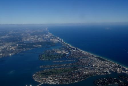 Montag 27.10.14: MIAMI => BARBADOS (Karibik) 3,5 Stunden Flugzeit (Abflug 8:55 h - Ankunft 13:20 h Ortszeit) Den Online-Check in auf der Website von American Airlines haben wir gestern Abend schon erledigt. Deshalb können wir heute noch entspannt frühstücken, stopfen dann unsere 7 Sachen ins Cabrio und bringen unseren Schlitten wohlbehalten zurück zu DOLLAR RENT A CAR am Airport. Der letzte Ausblick beim Abflug auf Miami Beach...schon nett, oder ? Wir kommen sicher wieder. Hoffen wir das die Hiobsbotschaften nicht eintreffen und sich irgendwann das Meer durch den steigenden Pegel diese Landzunge holt...