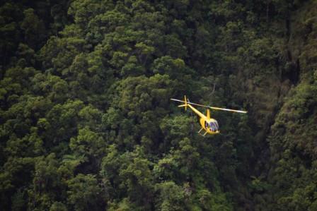 Dort werden wir vorab mit einem Film mit den wichtigsten Dingen vertraut gemacht. Alles sehr professionell. Dann werden wir mit einem Minivan zum Flughafen gebracht wo die Helis starten. Dort gibt es auch noch einmal eine persönliche Einweisung. Unsere Pilotin ist eine junge Australierin und hat dort erst im Office gearbeitet. Sie war so fasziniert das sie den Helicopterschein machte und seitdem mit Leidenschaft die Touristen durch die herrliche Landschaft fliegt. Sie ist sehr locker drauf und wir fühlen uns gleich wohl bei ihr. Airport Kauai von oben, süß... . Als wir über dem Meer starten sehen wir 2 x einen Wal in die Luft springen :-)) Was für ein Erlebnis was wir leider bildlich nicht festhalten konnten. Die Pilotin selbst meinte das man so etwas auch hier selten beobachten kann. Somit hat sich der Flug schon jetzt, kaum sind wir gestartet, gelohnt :-) Wir fliegen nun über eine tolle grüne Zone wo die Baumkronen von oben wir ein Puzzle ausschauen. Natürlich sind wir nicht die einzigen. Das Unternehmen hat mehrere Helis.