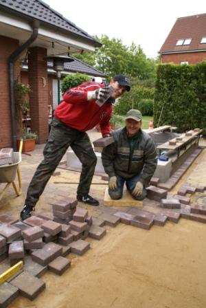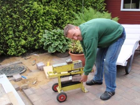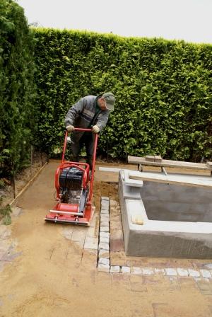Als wir Nachmittags fertig sind wird erstmal alles mit gewaschenen Füllsand leicht bedeckt und eingeschlämmt. Als es wieder abgetrocknet ist rüttelt Norbert mit seiner neuen Freundin alles ab. Auch das Granitpflaster bekommt man damit genau auf die Höhe der anderen Pflastersteine.