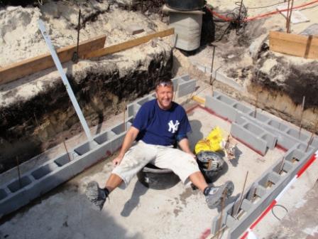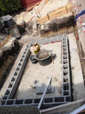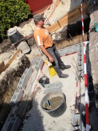 Die 1. Steinreihe legen sie nun über das Fugenblech (der Stein muss unten dafür noch nicht mal eingeschnitten werden da Hohlraum - Klasse !) in Sielbaumörtel und gleichen damit die Unebenheiten der Bodenplatte aus. Sielbaumörtel ist wasserdicht und trocknet sehr schnell an. Deshalb ist es gut wenn man einen fleißigen Helfer dabei hat. Um alles wirklich in Waage zu legen gehen für Laien schon ein paar Stündchen drauf. Aber nachher ist man doppelt so stolz.