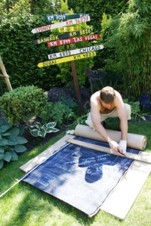 Überlappung von 8 cm je Bahn (ist 1 m breit) und zusätzlichen Eckenstreifen. Das Verarbeiten der Bahnen ist echt easy und in gut 2