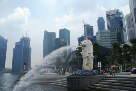An dem bekannten "Merlion" ist viel los. Ist aber auch ein nettes Fotomotiv. Bei den schwülen Temperaturen ist so ein Rundgang an der Marina Bay schon ausreichend. Hinter dem Merlion liegt das bekannte "Fullerton Hotel".