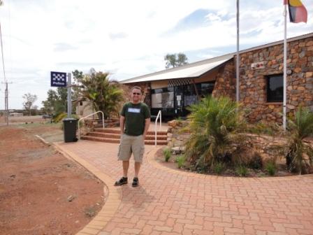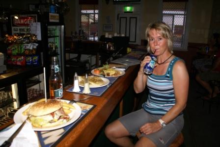 In Meekatharra-Town gibt es 3 Tankstellen, 1 Schlachter, 3 Motels, 1 Supermarkt (der natürlich Samstags um 17:00 h schon zu hat), 2 Bars wo man auch Essen kann und ein nettes öffentliches Schwimmbad, alle Achtung ! Hier tanzt der Bär ;-) Wir checken im nett aussehenden "Auski Inland Motel" ein. Unsere Kreditkarte funzt schon wieder nicht. Also cash 143 AUS$ (89 €) hingeblättert. Dafür durfte man umsonst ins Freibad, was uns aber vor der Nase dicht gemacht wurde. Nachteulen sind die Aussies nun wirklich nicht. Na gut, dann was Essen. Wir gehen in eine der Bars und müssen uns aber bis 18:00 Uhr mit der Essensbestellung gedulden, vorher gibt es nix. Also die halbe Stunde bei fast 50 Grad einmal die "Meile" rauf- und runtergelatscht und dann eine Limo am Tresen auf Ex vernichtet. Neben uns sitzt eine Backie, die per