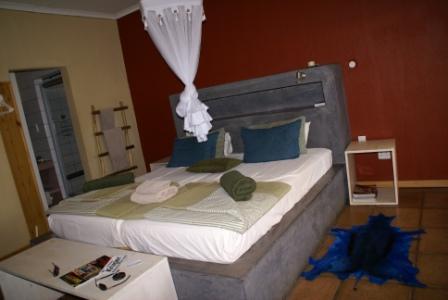 Danach checken wir in der "Sefapane Lodge" (Preis pro Nacht im DZ incl. Frühstück 103 €) ein. Wir sind zu früh, leider sind die Zimmer noch nicht fertig. Somit genehmigen wir uns einen alkoholfreien !! Drink und relaxen in der Anlage. Die Lodge wurde uns von meiner Kollegin Maren empfohlen die letztes Jahr mit Ihren Eltern dort Abends gegessen hat. und sie hat nicht zuviel versprochen !! Die einzelnen Bungis haben alle Tiernamen, das ist nett gemacht. Wir beziehen die Hippo-Hütte.