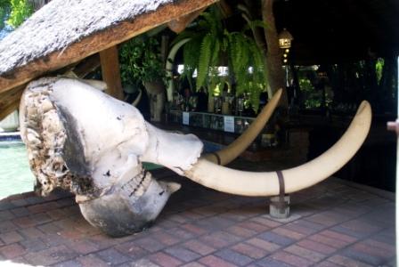 Dann fahren wir mit unserem 4 x 4 auch auf unbefestigte Wege, sehen aber danach nicht mehr viele Tiere. Deshalb stoppen wir am "Letaba Camp" und essen eine Kleinigkeit. Bei mir gibt es wieder "Greek Salat"... naja, heiß wie in Griechenland ist es heute wirklich. Vor dem Restaurant gibt es eine tolle Ausichtsterasse auf ein Wasserloch. Dort kann man herrlich relaxed sitzen und nur genießen. Dann machen wir uns auf den Rückweg, springen noch mal in den herrlichen Pool unserer Lodge. Toll ist auch die Deko, ein richtiger Elefantenschädel