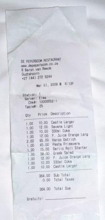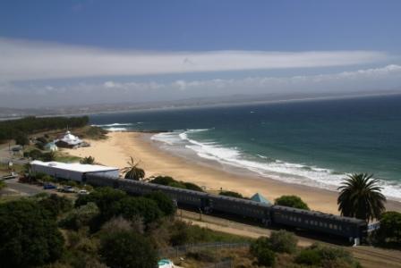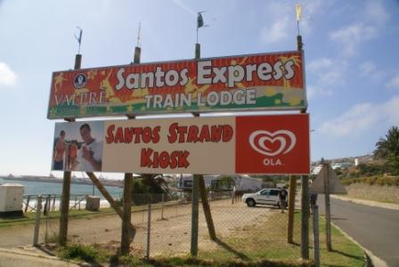 Tag 16: 01.03.2009 KNYSNA => OUTDSHOORN (über Mossel Bay) (240 km) Gefrühstückt wird heute um 7:00 Uhr. Es klart auf und wir fahren die N2 nach Mossel Bay. Dort steht ein alter Bahnwagon (der Santos-Express) am Strand des "Santos Beach" der Unterkunftsmöglichkeiten für Backpacker anbietet und wo es auch ein Restaurant gibt. Der Strand ist menschenleer. Wo sind denn die ganzen Backies ?