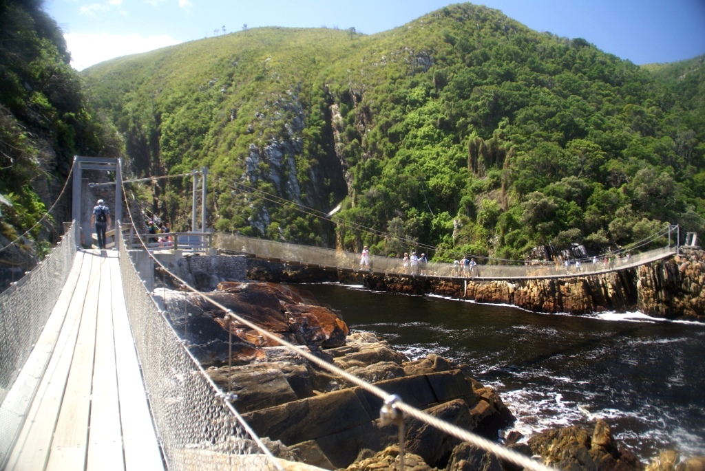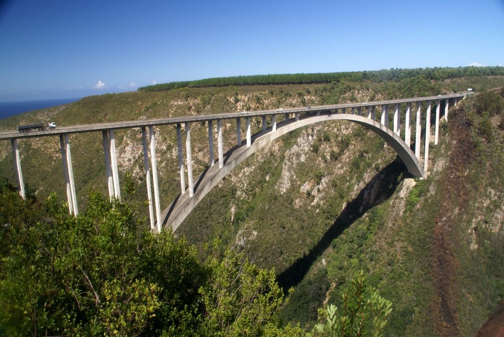 Wir stoppen bei der "Bloukranbridge" in Tzizikamma und schauen den Leuten beim Bungy-Sprung zu.  Natürlich gibt es dort auch wieder Outdoor-Shoppingmalls ;-)) Die Typen sind echt nett und auch nicht nervig. Leider ist kein Souvenir dabei was uns gefällt. Man kann auch unter der Brücke als Gast zu der Stelle laufen wo die Leute abspringen. Aber Kameras sind dort untersagt. Nö, dann nicht.