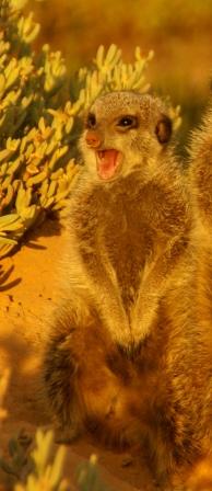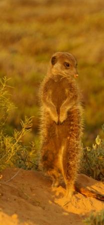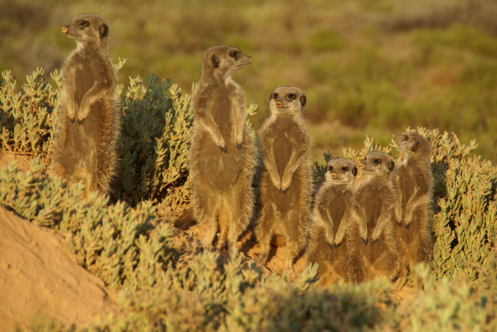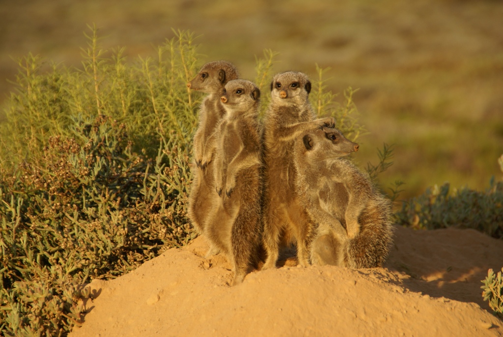 Meerkatzen (bei uns auch Erdmännchen genannt) morgens bei Sonnenaufgang aus
