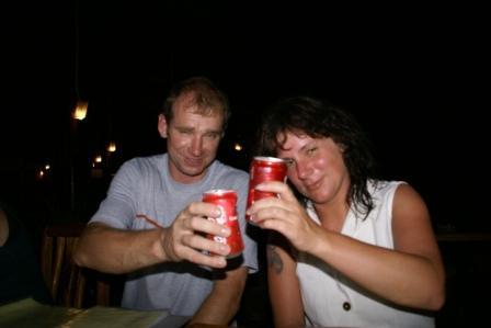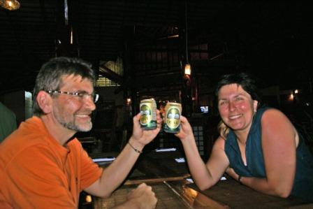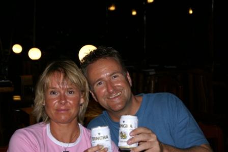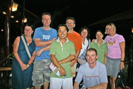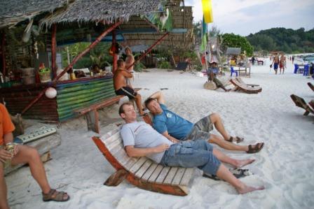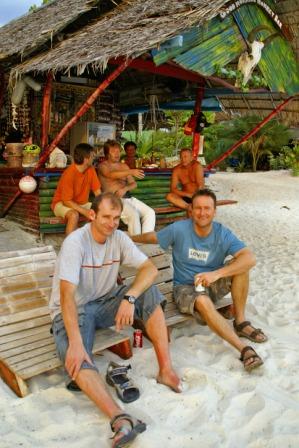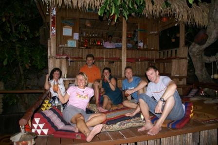 Nun war unser letzter Abend angebrochen und wir 6 gingen Abends noch mal rüber zum Pattaya Beach. Vor den Essen machten wir es uns vor einer der netten Strandbars gemütlich und tranken noch was. Es war eine wirklich gute Stimmung. Morgen werden sich unsere Wege wieder trennen. Die 4 wollten weiter nach Phi Phi und wir nach Langkawi. Die Fährtickets hatten wir vorhin bei "Pooh"  gebucht. Bei Pooh kann man wohnen, Essen, e-mails checken, Geld wechseln und auch Fährtickets buchen. Seine Bar liegt mitten in der Insel auf dem Weg zwischen unserem Mountain Resort und dem Zugang zum Pattaya Beach. Man kommt automatisch daran vorbei.