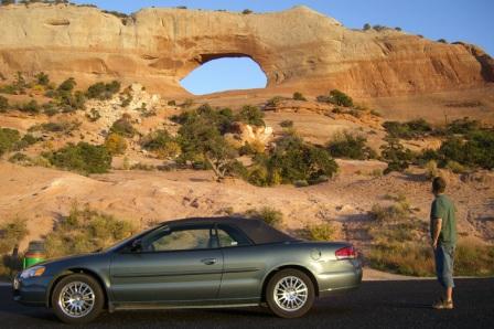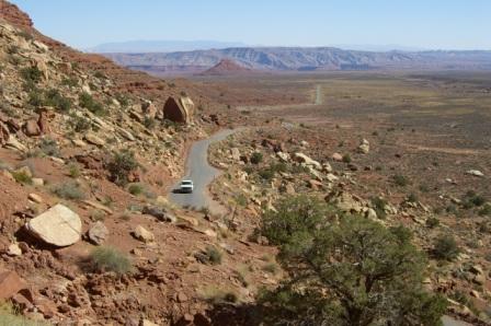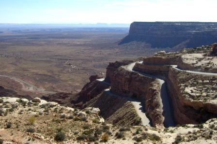 Nachtrag: Seit 2008 gibt es hier ein Hotel mit direktem Blick auf den Monumente... ich weiß nicht ob ich das für schön befinden soll, denn das Gebäude ist irgendwie gar nicht hübsch. Besser wäre ein Poolblick auf die Monumente. Ich kenne aber jemanden die dort gewohnt hatten und die fanden es toll. http://www.monumentvalleyview.com/ Mit dem Cabrio haben wir aber einige Schwierigkeiten um auf den Weg nach unten zu kommen. Ist wohl tiefer gelegt das Teil...hi,hi. Danach geht es weiter Richtung Moab. Wir machen noch einen Abstecher über Natural Bridges Monument (lohnt sich nicht) und Mexican Hat (auch nicht unbedingt den Umweg wert gewesen). Um die Route hier bei google-Maps vollständig zu sehen bitte mit + / - oben links bearbeiten
