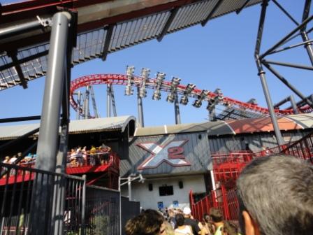 Die Eintrittstickets haben wir günstig Zuhause online für 36,99 $ erworben und ausgedruckt. Somit müssen wir auch nicht anstehen und wandern direkt zu "X2" ... aber dort ist eine Wartezeit von 3 !!! Stunden !! angeschlagen. Da der Park leider im September nur am WE auf hat sind die Wartezeiten natürlich etwas länger, aber das ist uns "etwas" zu lang. Wir fahren erst die anderen Bahnen und gehen dann am Ende des Tages noch mal hierher.