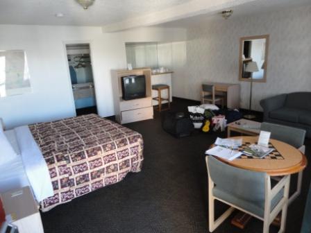 Wir checken für ein Nichtraucherzimmer ein und bekommen ne Rauchersuite... . Nach diversen hin- und her- Diskutiererei mit der Managerin, weil kein anderes Zimmer mehr frei ist gehen wir mit der Putzfrau in die "tolle" Suite. Diese ballert erstmal auf unsere Anweisung ne Flasche Febreeze in die Vorhänge. Danach geht es dann mit dem Geruch. Die Raumgröße ist natürlich cool. So können wir uns die letzten 2 Nächte hier etwa ausbreiten. Das Zimmer ist aber schon recht abgewohnt und der Barhocker bricht gleich nach der 1. Benutzung unter mir zusammen. Sind daran etwa die ganzen Burger Schuld ? Und die Wolldecke.... tzzz.... die ist so hart als ob sie schon seit der Moteleröffnung hier wohnt.