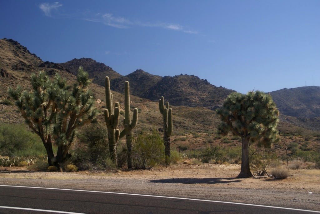 Danach geht es weiter und es wird immer heißer. Wir lassen uns die heiße Luft um die Ohren wehen und genießen den Wechsel der Landschaft in Wüste mit vielen Saguaro-Kakteen.