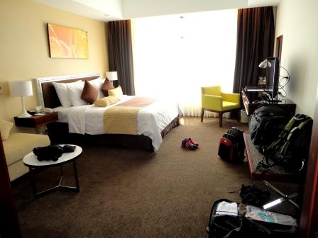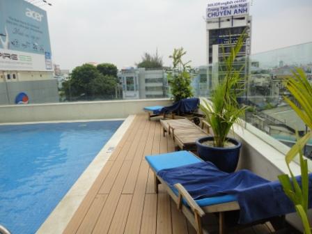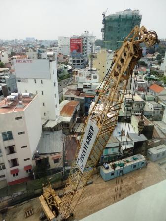 Unser Flieger von Vietnam Airlines startet pünktlich um 11:20 Uhr und bringt uns in etwas über 1 Stunde nach Hoh Chi Minh City (ehemals Saigon). An Bord gibt es sogar noch warmes Essen. Allerdings Fisch mit Reis. Nix für mich. Der Nachbar isst mit den Fingern, da genieße ich lieber noch gedanklich den Katenschinken von heute Morgen auf Vollkornbrot JJJ. Die Koffer sind eher am Band als wir dort sind, da bei der Passkontrolle Systemausfall ist. Draußen überschlagen sich die Taxifahrer um uns irgendwo ins Nivana zu bringen. Aber wir ziehen erstmal aus dem nächsten ATM 2.000.000 Dong Dongs. (Das sind leider nur ca. 75 €) und bestellen uns drinnen ein Taxi (das war ein Fehler - zu teuer - aber das wussten wir zu diesem Zeitpunkt aber nicht nicht). Für 10 US$ brachte ins eine Fahrerin ins nur 10 Minuten entfernte "Starcity Hotel". Der Ausblick war schon super... wenn es brennt haben wir ne schnelle Feuerleiter. Aber gehört haben wir von dem Baulärm nichts.