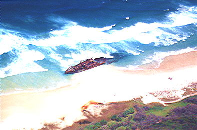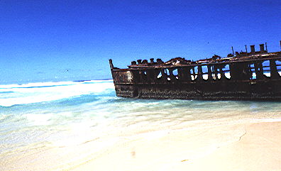 Wir fahren am "Seventy Five Mile Beach" entlang und stoppen am "Maheno Schiffswrack". Im Juli 1935 strandete der Dampfer nach einem Sturm an der Ostküste von Fraser Island.