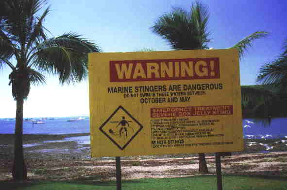 Tag 15: 27.03.00 Nach 150 km kommen wir in "Airlie Beach" an. Ab hier kann man zu dieser Jahreszeit nicht mehr baden weil hier die tropische Zone anfängt die die Stingers (auch Box Jelly fish genannt) mit sich bringt. Überall sind Warnschilder an den Stränden die man ernst nehmen sollte.