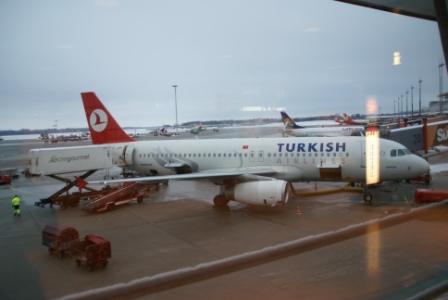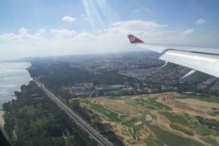 Am Check-In werden wir am roten Teppich begrüßt. Eigentlich First-class, aber auch für Onlinecheckinner wie wir es sind. Das stößt doch einigen in den langen Schlangen auf. Dann ein Anruf von Sabine, die uns hingebracht hat, hab´ ich doch glatt den "blauen Jörg" bei ihr hinten im Auto liegen lassen... so ein Pech ! Der Abflug nach Istanbul startet pünktlich mit "HARRAN". Jede der Maschinen dieser Gesellschaft hat einen Namen. Macht sie mir doch gleich sympatischer... An Bord gibt es leider kein Döner, obwohl auf den Essen ähnliches geschrieben steht entpuppt es sich als gefüllte Aubergine, die aber auch genießbar ist. In Istanbul können wir dann nicht gleich landen und kreisen noch ca. 1 Std. über der Big City. Was wollen die alle hier ? Schlussverkauf ?