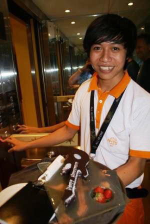 Im Fahrstuhl dann leider nicht unser Zimmerservice. Er hat leckeren Honeymoon-Kuchen in Gitarrenform dabei - entführen ???