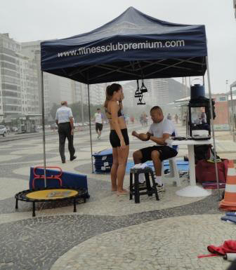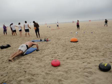 Viel ist noch nicht los, nur etliche Fittness-Verrückte geben sich ihren Zwang hin und trainieren was das Zeug hält. Da gibt es doch extra jemanden der sich auf das Dehnen der Läufer hier spezialisiert hat. und ein andere schmeißt einfach ein paar billige Hanteln und Bälle in den Sand und nennt das Fittnesscenter. Im hübsche, schlanke Frauen "vermessen" hat er deutlich mehr Freude als den schwergewichtigen als Personaltrainer zur Seite zu stehen.