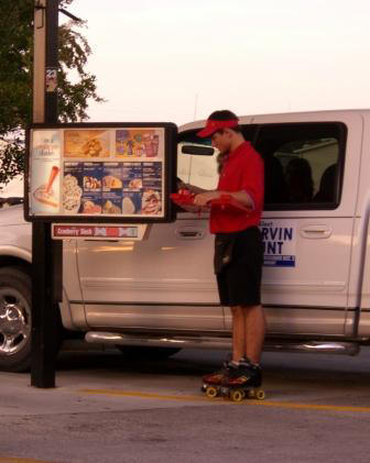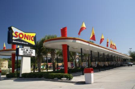 SONIC Burger, einzelne Parkboxen mit Speisekarte. Bedienung kommt zum Auto (manchmal sogar mit Rollschuhen)