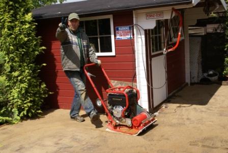 Als wir Nachmittags fertig sind wird erstmal alles mit gewaschenen Füllsand leicht bedeckt und eingeschlämmt. Als es wieder abgetrocknet ist rüttelt Norbert mit seiner neuen Freundin alles ab. Auch das Granitpflaster bekommt man damit genau auf die Höhe der anderen Pflastersteine.