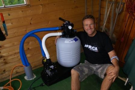 Im riesigen Karton befand sich die Sandfilteranlage "Sandy 50" von Swim-tec mit "BADU Picco Pumpe 5" von der Fa. Speck die mit Saug- und Druckanschlüssen DN 38 mm ausgestattet ist. Das passt hervorragend zu unserer Verrohrung. Das gute ist, wenn man die Pumpe beim Poolpowershop kauft, bekommt man bei Ausfall in der Zeit der Reparatur sofort eine Ersatzpumpe gestellt. Die Reparaturzeiten sind sehr kurz und man muss keine Angst haben das der Pool "umkippt". Toller Service, den wir aber hoffentlich nicht so schnell beanspruchen müssen. Norbert mit seiner neuen Freundin "Sandy" Trotz unseres Mini-Beckens mussten wir doch etwas tiefer als gedacht in die Tasche greifen da die Pumpe über den Wasserspiegel steht und sie selbstansaugend sein muss.