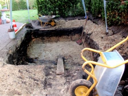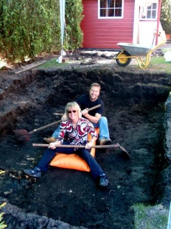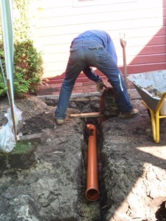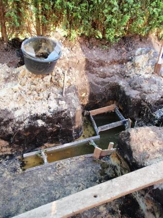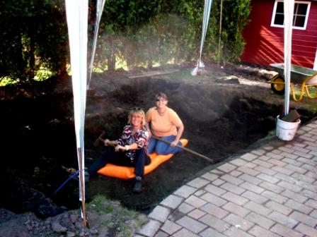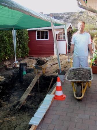 Norbert baut nun schon eine Graben für das KG-Rohr wo nachher der Schlauch zur Pumpe und die Stromleitung reingelegt wird. Diesen riesigen Schacht müssen wir noch "versenken" bevor wir anfangen können mit der Drainage für die Absenkung. Denn nur ein paar cm und wir sind im Grundwasser.