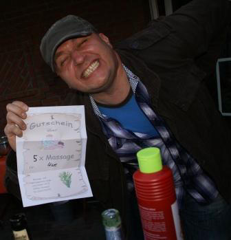 Auch "Meister" Uwe freut sich über einen Massage-Gutschein wegen seines Rückenleidens nach dem Schachteinbau