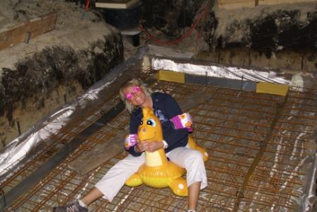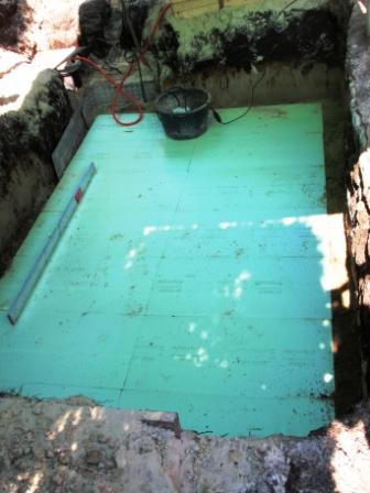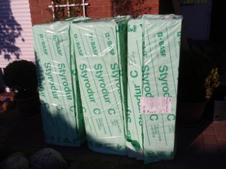 Aus dem Baustoffhandel besorgen wir noch "Styrodur" in 8 cm Stärke die wir als Dämmung unter die Betonsohle auf das Erdreich legen werden. Wegen dem kalten Grundwasser wurde uns das empfohlen damit wir nicht im Pool nachher Socken anziehen müssen....