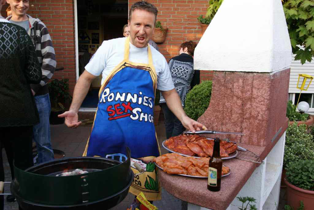 Grillmeister Norbert ist gut gerüstet um alle Gäste zu bewirten. Da kommt endlich mal die neue Grillschürze aus Südafrika zum Einsatz. Seht Ihr Fil & Marion aus der Marula Lodge, wofür sie gebraucht wird.