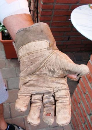 Die Handschuhe sind durch und der linke Arm will nicht mehr so wie er.  Der Schachteinbau war wohl doch zu heftig. Nun muss er ihn wohl lieber ein paar Tage schonen. Also wird die Schüttung der Bodenplatte wohl um eine Woche verschoben werden müssen. Schließlich muss ja noch die Schalung die und Bewehrung vorbereitet werden.