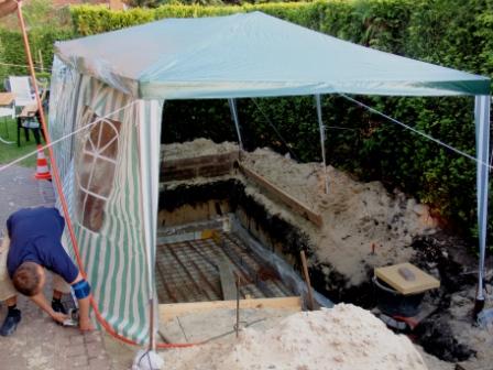 Shit, heute kam mein Daddy vorbei, guckte ins Bauloch und meinte zu Norbert: "Du, das ist ja gar nicht mehr so tief"... was war passiert ??? Da wir die Baugrube gegen den starken Regen mit einem Pavillon gesichert haben  hat Norbert den Schlauch der Pumpe wohl irgendwo eingeklemmt...