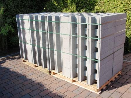 Die 1. Steinreihe legen sie nun über das Fugenblech (der Stein muss unten dafür noch nicht mal eingeschnitten werden da Hohlraum - Klasse !) in Sielbaumörtel und gleichen damit die Unebenheiten der Bodenplatte aus. Sielbaumörtel ist wasserdicht und trocknet sehr schnell an. Deshalb ist es gut wenn man einen fleißigen Helfer dabei hat. Um alles wirklich in Waage zu legen gehen für Laien schon ein paar Stündchen drauf. Aber nachher ist man doppelt so stolz.