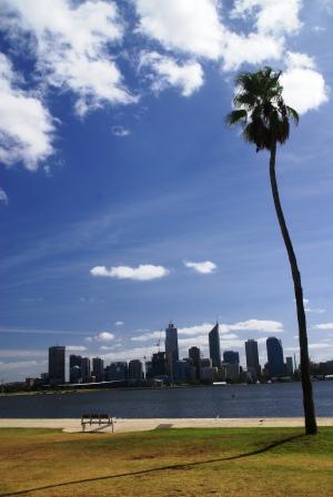 Unser 1. Stop ist auf der anderen Seite des Swan Rivers. Dort kann man wundervoll am Strand die komplette Skyline fotografieren.