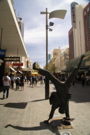 Danach parken wir am "Outlet" Center, wandern dort ein bisschen durch die Läden, und quetschen uns dann in ein enges Parkhaus in der Nähe der Murray Street. Wir schlendern durch die bekannte Fußgängerzone der Murray und Hay Street mit hunderten von Läden, der Hammer ! Auch viele Straßenkünstler sind hier. Echt nett gemacht. Die Gegensatz der Architektur zwischen alt und neu ist echt gelungen.