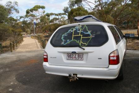 Da wir noch Zeit haben besuchen wir den gegenüberliegenden Wildlifepark. Ich hatte im Internet gelesen das jemand schrieb das es sich lohnt. Allerdings hatte der 5,50 $ Eintritt bezahlt und wir jetzt 8 $. Denke man das ist schon ein paar Jahre her wo derjenige dort gewesen ist. Es lohnt sich NICHT !!! alles ist sehr verkommen und dreckig. Hier würden echt mal ein paar Backpackers einen guten Job machen können und den Laden auf Vordermann zu bringen. Das schlimme ist das der Souvenirshop und das Restaurant für die Reisebusse ?? geleckt ist... schrecklich ! Spart Euch das also. Das weiße Kängaruh seht Ihr hier nun gratis... Witzig war die Familie die in diesem Kombi durch Australien reist und hinten auf der Heckscheibe die Reiseroute aktualisiert. Tolle Idee !!