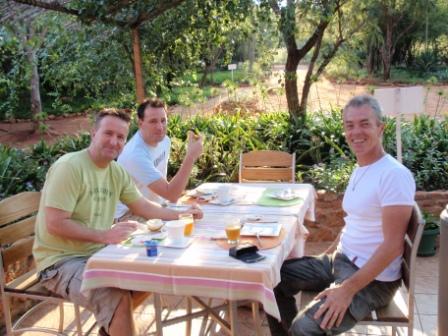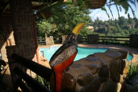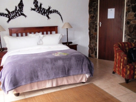 Die Auswahl an Moskitosprays ist riesig. Wir entscheiden uns für eine Dose die alles killt was fliegt und krabbelt. Leider ist dickster Nebel auf dem Pass das wir auf der schönen Passstraße rein gar nix sehen ... In Sabie kommen wir gegen 15:00 Uhr an und stehen vor verschlossenen Gate der "Valley View Lodge" (Preis pro Nacht im DZ incl. Frühstück 62 €)von Fred & Demi. Nach mehrmaligen Läuten kommt ein Schoko ans Gate, lässt und aber nicht rein. Wir sollen den Besitzer anrufen. Wie gut das es Handys gibt. Wir rufen Fred an und er steht 5 Minuten später am Tor. Er zeigt uns unsere schönen Zimmer und führt uns durch seine hübsch Lodge die sehr geschmackvoll eingerichtet ist.