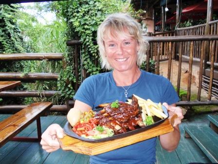 Der Ort Sabie ist sicher, das man Abends auch im dunkeln in den Ort zum Essen gehen kann. Das haben wir auch genutzt und haben das Auto stehen lassen. Wir sind zum Restaurant, welches ein alter ausrangierter Bahnwagon ist, gelaufen (ca. 15 Minuten Fußweg - ist direkt im Ort). Da es aber sehr heiß ist heute Essen wir draußen mit Blick auf den Minigolfplatz. Und wen treffen wir dort ? Fred und seine Perle die dort auch sitzen und Essen. Wir bestellen leckere Spare Ribs, die wirklich gut waren. Mit Vorspeisen und 4 Getränken zahlen wir zu zweit 26 € - der Preis stimmt und wir rollen aus dem Wagon.