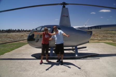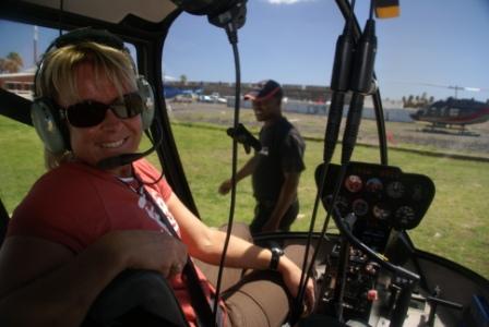Da es erst Mittags ist wollen wir mal bei  der V & A spontan versuchen einen Heli-Flug über Kapstadt zu buchen. Und es klappt sogar SOFORT !!!  Wir werden ein paar Minuten später mit einem Golfcar abgeholt und und zum Start- und Landeplatz am Hafen gefahren.