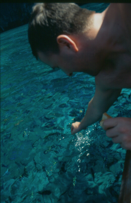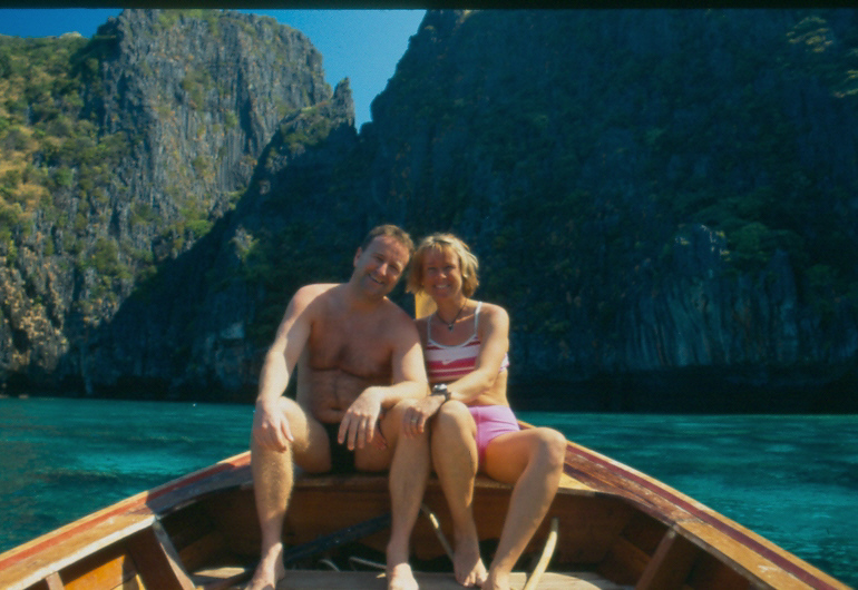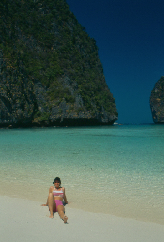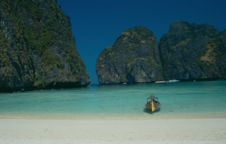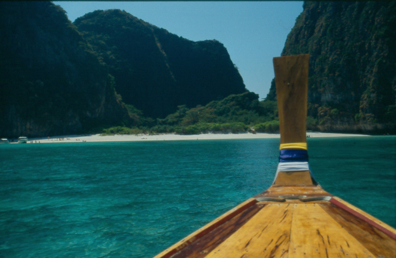 20.02.2005 PHI PHI ISLAND Heute haben wir einen Tagesausflug dem hauseigenen Longtail zur Maya Bay und nach Bamboo Island unternommen. Wir waren ganz alleine auf dem Boot und es war superbillig (1000 THB ~ 20 €). Das lag aber sicher daran das die Angestellten beschäftigt werden mussten. Wir waren von 9.00 h -17:00 Uhr unterwegs. Zuerst ging es zur Maya Bay. Die Fahrt dauerte so rund 45 Minuten.