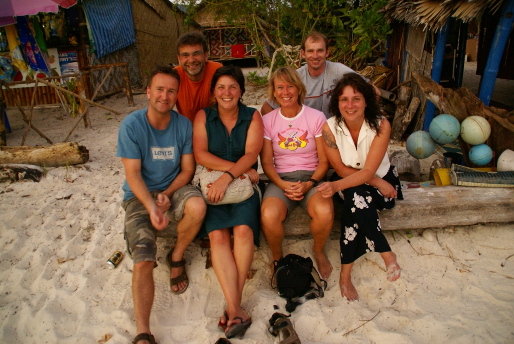 Nun war unser letzter Abend angebrochen und wir 6 gingen Abends noch mal rüber zum Pattaya Beach. Vor den Essen machten wir es uns vor einer der netten Strandbars gemütlich und tranken noch was. Es war eine wirklich gute Stimmung. Morgen werden sich unsere Wege wieder trennen. Die 4 wollten weiter nach Phi Phi und wir nach Langkawi. Die Fährtickets hatten wir vorhin bei "Pooh" gebucht. Bei Pooh kann man wohnen, Essen, e-mails checken, Geld wechseln und auch Fährtickets buchen. Seine Bar liegt mitten in der Insel auf dem Weg zwischen unserem Mountain Resort und dem Zugang zum Pattaya Beach. Man kommt automatisch daran vorbei.