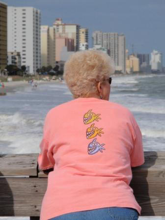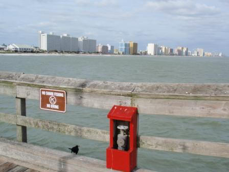 Das Wasser hier ist auch nicht so dolle. Na, vielleicht ist es besser wenn es nicht so stürmisch ist , aber die Karibik darf man hier noch nicht erwarten. Aber deshalb sind wir ja auch nicht hier. Der Ort hat sonst viel zu bieten. Es gibt einige Shopping Outlet Malls (TANGER OUTLET´s) wo man wirklich sehr, sehr gut und günstig einkaufen kann. Außerdem gibt es hier bestimmt 100 FastFood Läden (wichtig für uns **grins**) und seit neustem den seit Mai eröffneten "HARD ROCK PARK" . Aber dazu übermorgen mehr. Denn er macht in der Nebensaison nur von Fr - So auf. Wir nutzen den Tag heute für einen Strandspaziergang an der Skyline und spazieren auf´s Pier wo wir doch tatsächlich noch 1 $ Eintritt zahlen müssen obwohl wir nun wirklich nicht wie Angler aussehen. Hier gibt es das leckerste Erdbeereis, eine riiiesen Tüte, wovon ich leider nicht viel habe weil mein Cap sich selbstständig macht und ich es festhalten muss.  Das Eis dadurch durch die Gegend schleudere und ...naja... haben die Vögel auch was Gutes.