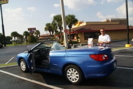 Die blonde Lady am Mietwagenschalter ist fähig. Leider hat BUDGET den Mustang Convertible nicht mehr im Programm. Nur noch den Chrysler Sebring als 4-Sitzer. Ist nicht schlimm denken wir uns, denn den kennen wir von vorherigen Urlauben und wissen das immer genug Platz im Kofferraum ist. Da sie noch 2 da hat fiel die Auswahl diesmal auf einen blauen. Ohje, das ist ja schon das neuste Modell mit dem total versenkbaren Verdeck denken wir als wir in die Garage gehen... somit ist der Kofferraum nur noch halb so groß wie sonst, shit ;-( Somit müssen 2 Gepäckstücke auf den Rücksitz Platz nehmen. Für unsere paar Tage hier jetzt nicht schlimm da wir die Sachen immer im Motel lassen werden. Schlechter wäre es auf einer Rundreise durch den Westen der USA wo man zwischendurch in Nationalparks rumspaziert. Also Leute, der Sebring leider ist nur noch bedingt zu empfehlen !!!